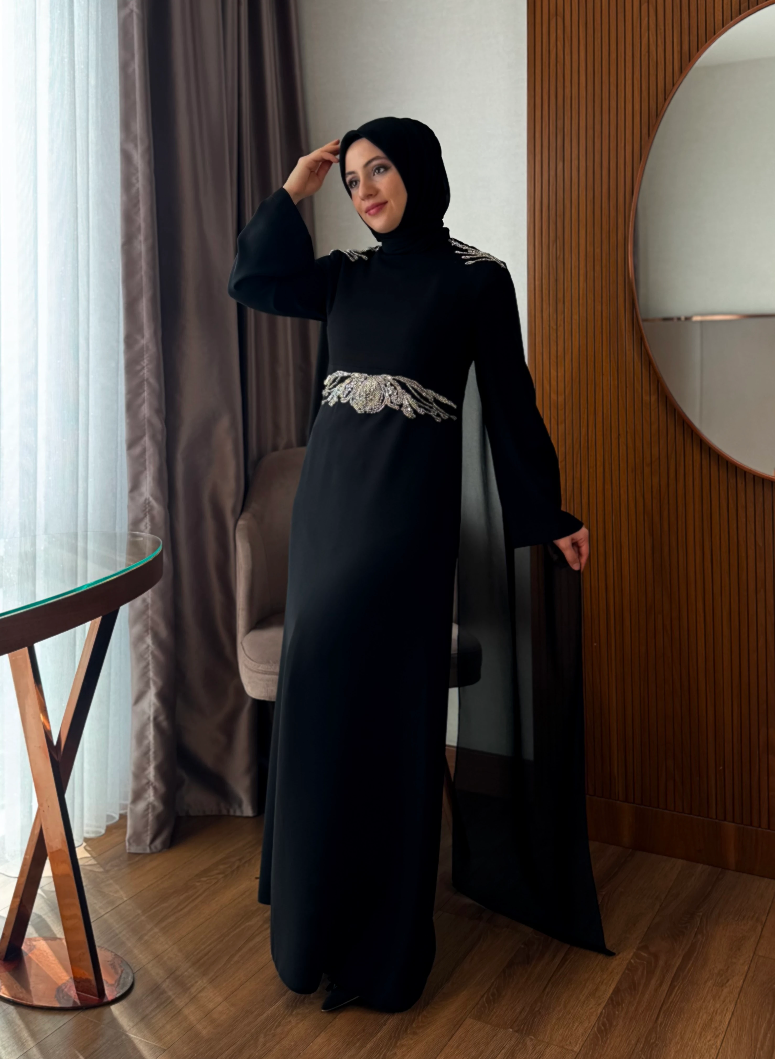 Omuzlarında arkaya doğru uzanan şifon pelerinli vardır.