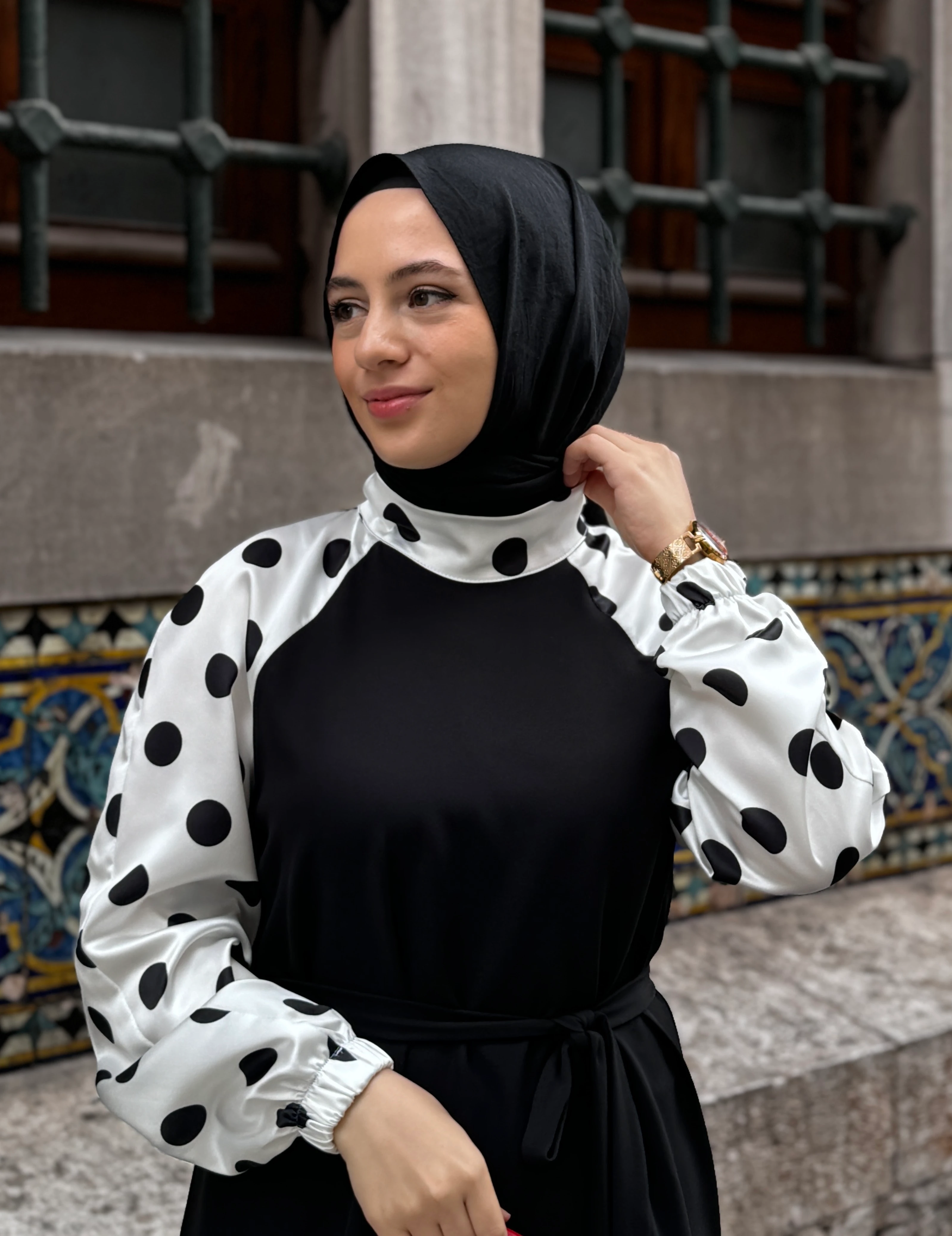 Puantiyeli kumaşı mat asetat satendir, dökümlü ve tok durur.